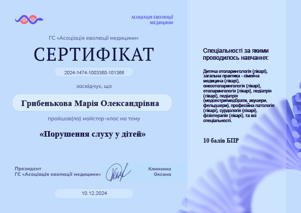 • Майстер-клас" Порушення слуху у дітей" Асоціація еволюції медицини, дистанційно( 10.12.24)
