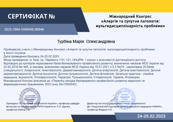 • Міжнародний конгрес "Алергія та супутня патологія: мультидисциплінарність проблеми" м.Київ (24-25.02.23)