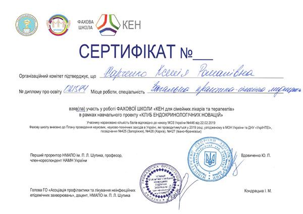 - Участь у роботі професійної школи "КЕН для сімейних лікарів та терапевтів" у рамках навчального проекту "Клуб ендокринологічних новацій" (Запоріжжя, 2019)