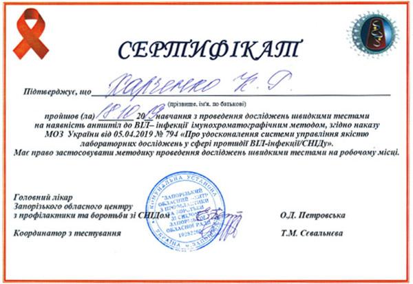 - Інтернатура в Запорізькій академії післядипломної освіти і отримання сертифікату лікаря-фахівця за фахом "Загальна практика - сімейна медицина" (2020 р.)