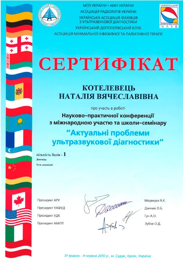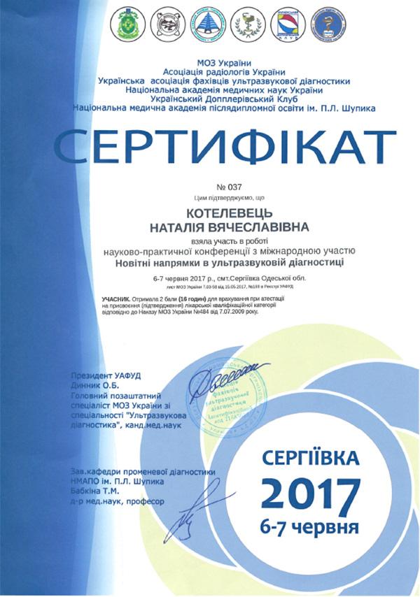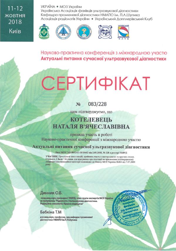 Лікар Котелевець є кваліфікованим фахівцем в області ультразвукової діагностики. Наталія В’ячеславівна досконало володіє технологією доплерометріі. Також лікар Котелевець проводить УЗД органів малого таза у жінок і органів черевної порожнини, постійно вдосконалює свої навички на курсах, практичних семінарах і майстер-класах.