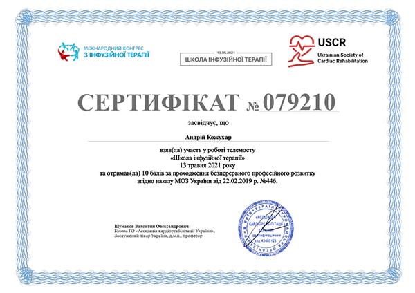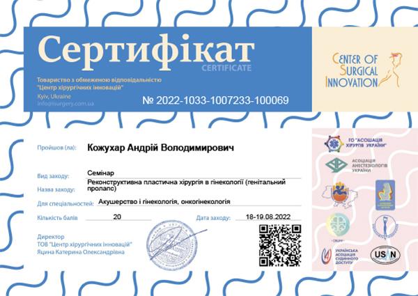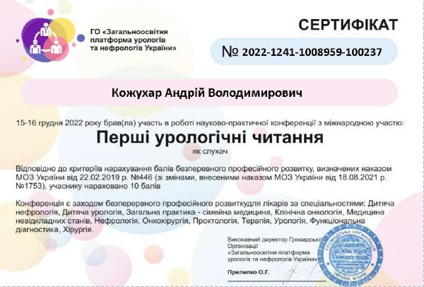 • Інтернатура при "Запорізькому державному медичному університеті" за спеціальністю "Урологія" (2002 р.)