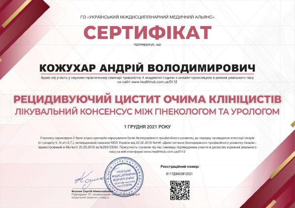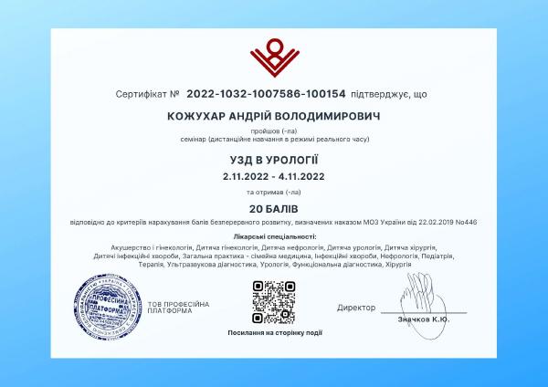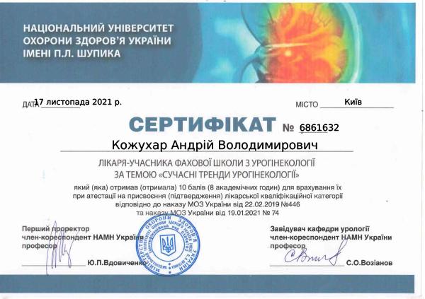 Андрій Володимирович – лікар вищої категорії, є провідним фахівцем у галузі урології. Займається діагностикою та лікуванням урологічної патології. Провів понад 3000 урологічних хірургічних втручань. Консультує пацієнтів з новоутвореннями. В лікувальній практиці Кожухар Андрій Володимирович призначає сучасні схеми діагностики та лікування, реалізує у своїй роботі останні новинки медицини.