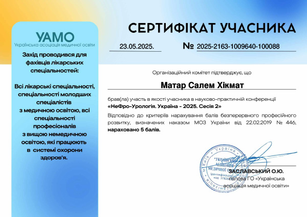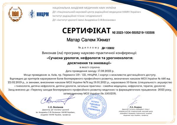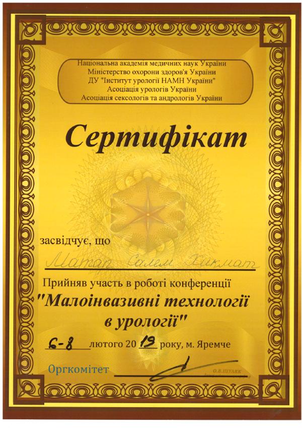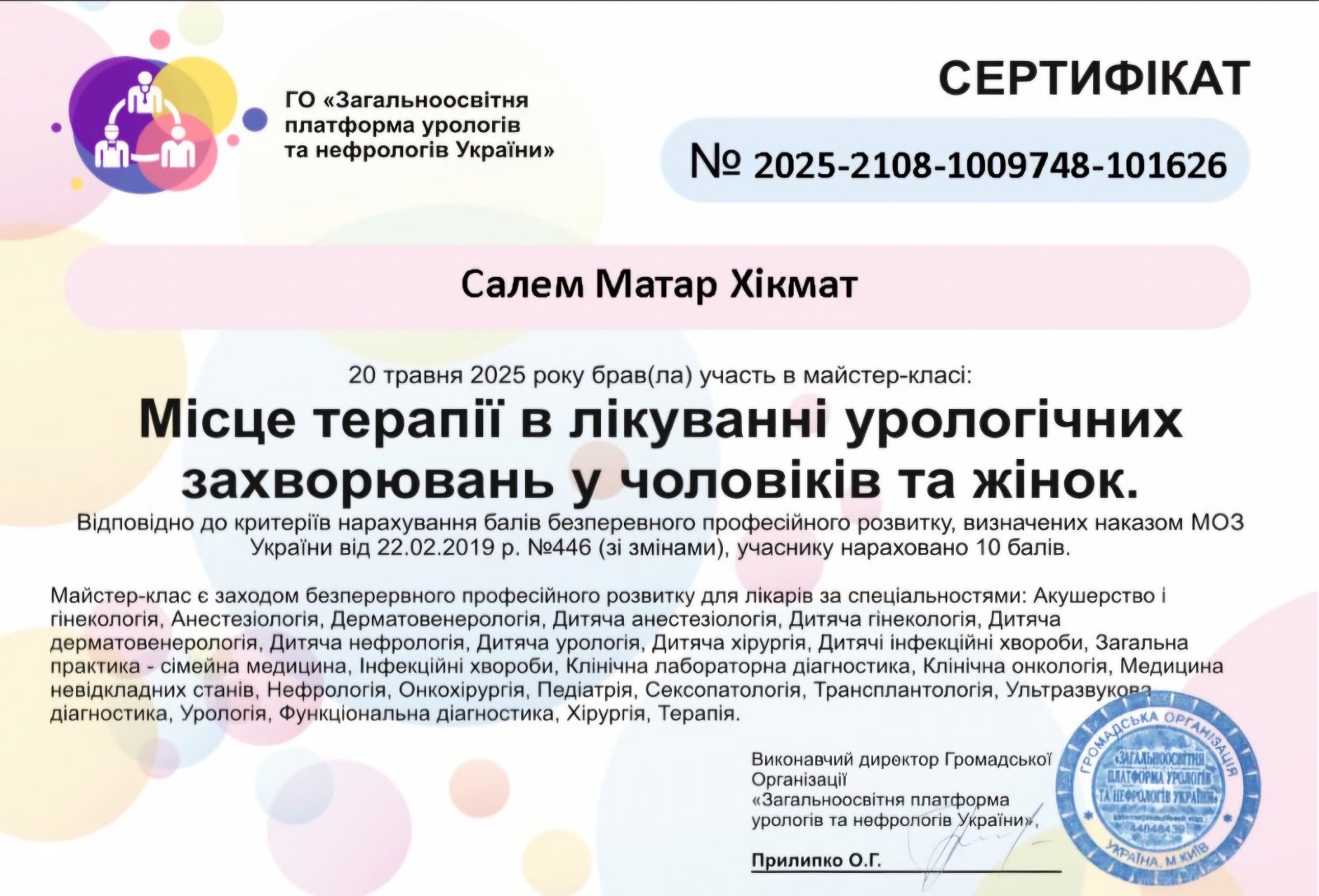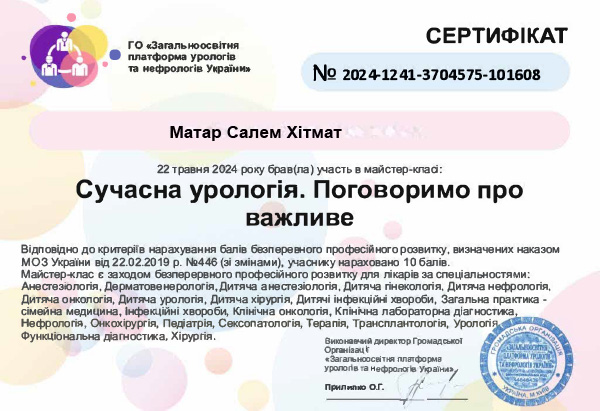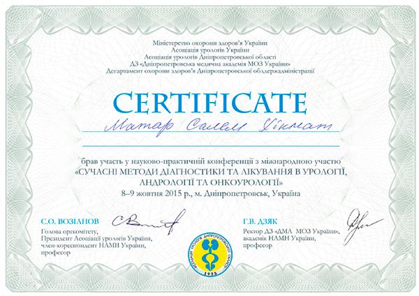 - Спеціалізація для підтвердження кваліфікації в Запорізькій медичній академії післядипломної освіти, отримання сертифікату лікаря-спеціаліста за спеціальністю «Урологія» (2015 р.)