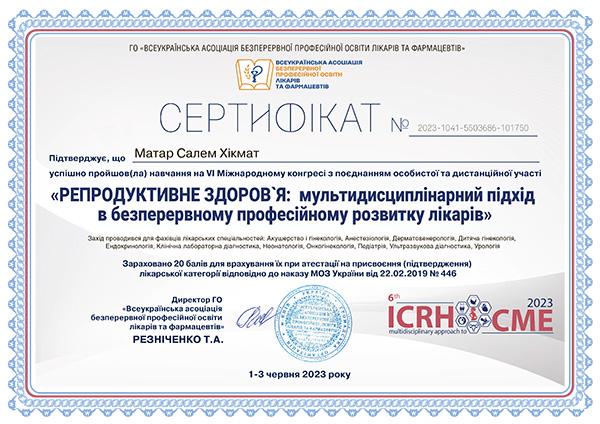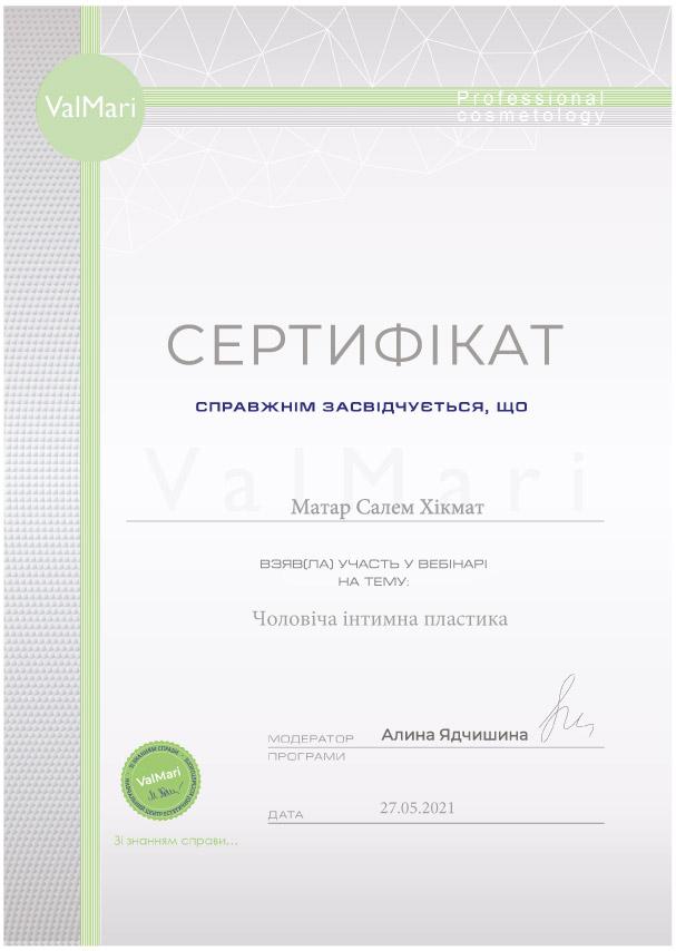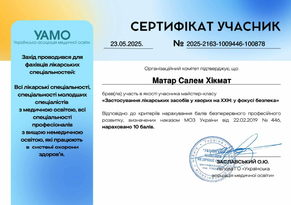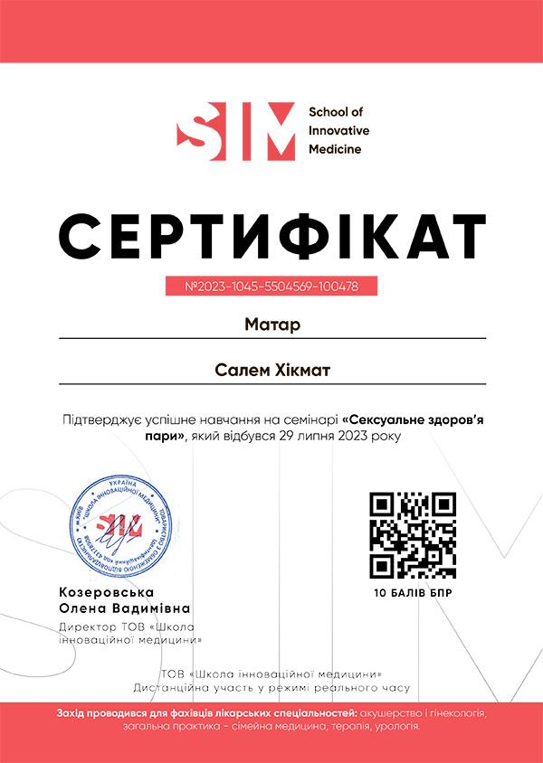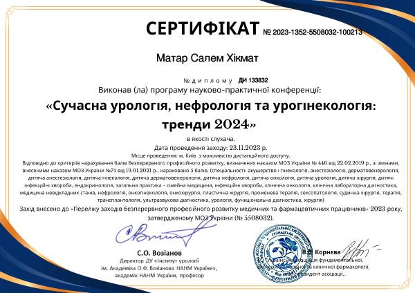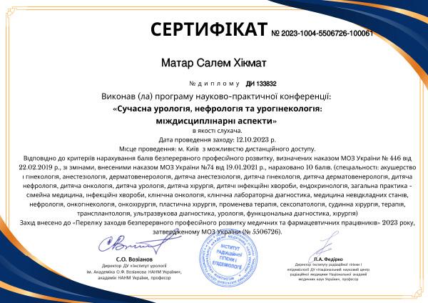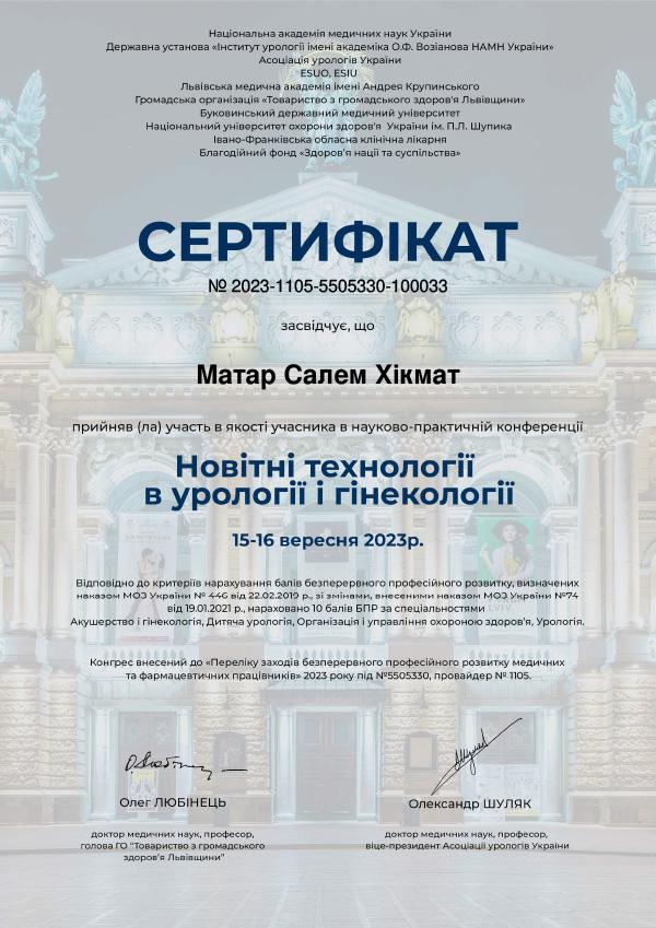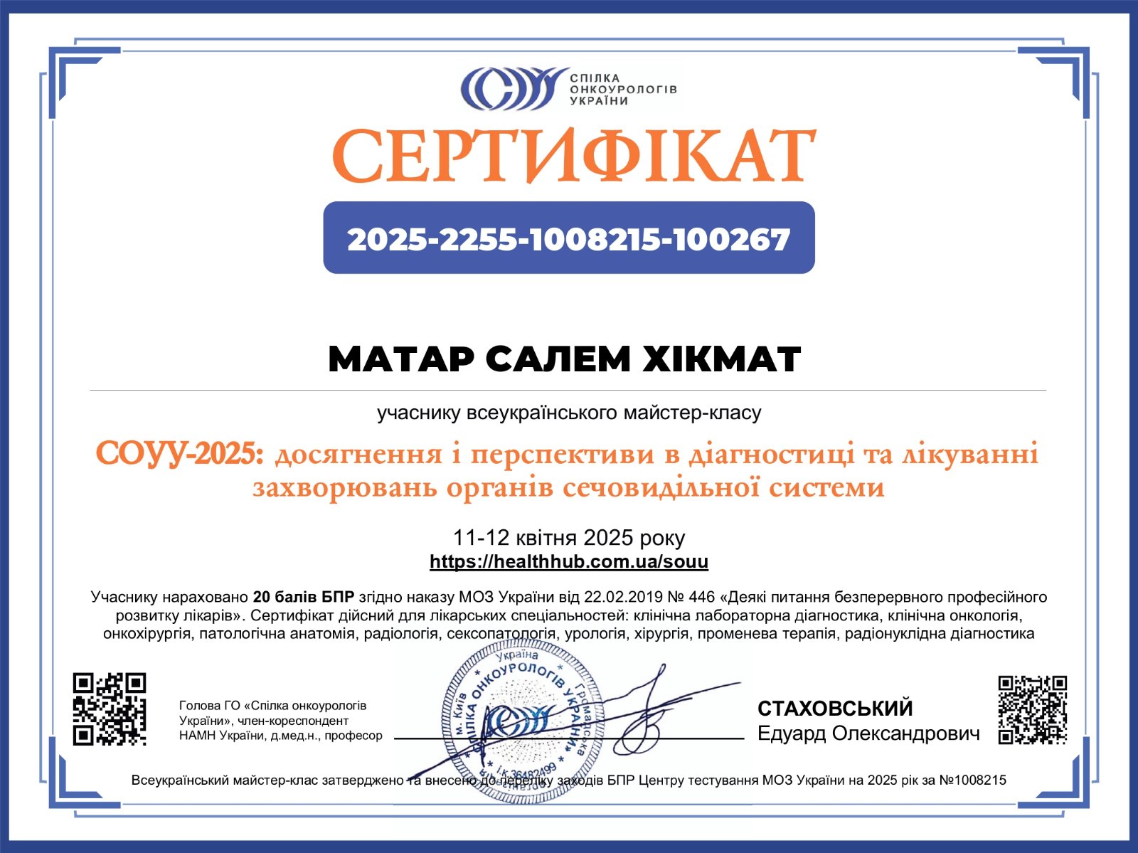 - Спеціалізація для підтвердження кваліфікації в Запорізькій медичній академії післядипломної освіти, отримання сертифікату лікаря-спеціаліста за спеціальністю «Урологія» (2015 р.)