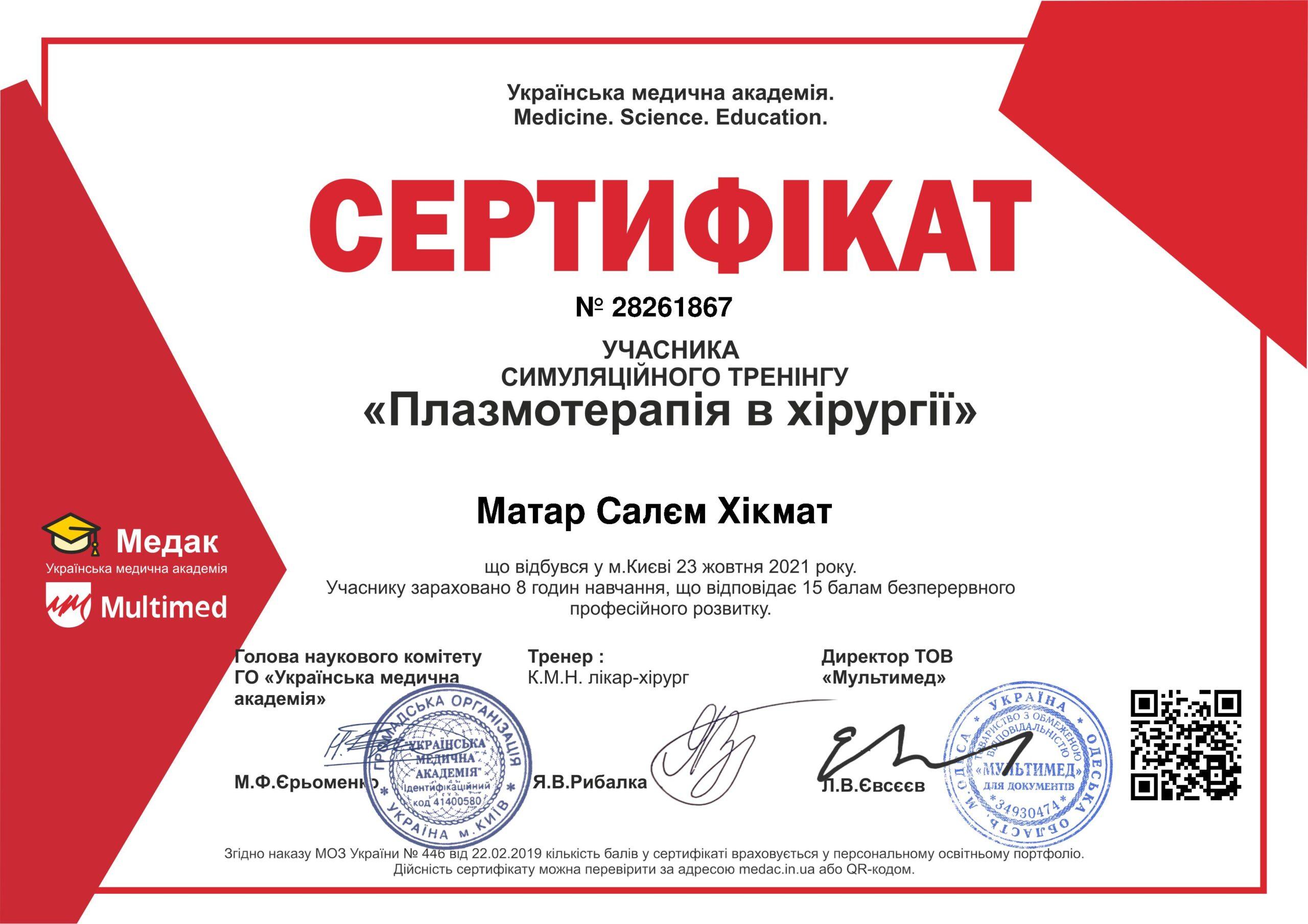 Лікар Матар Салем Хікмат є провідним фахівцем в області урології, андрології. Бере активну участь в роботі міжнародних медичних асоціацій. Лікар Матар Салем Хікмат виконує ендоскопічні методи хірургії з застосуванням лазера, надає медичну допомогу при патологіях андрології та сексопатології, проводить лікування вроджених і набутих захворювань статевих органів у чоловіків.