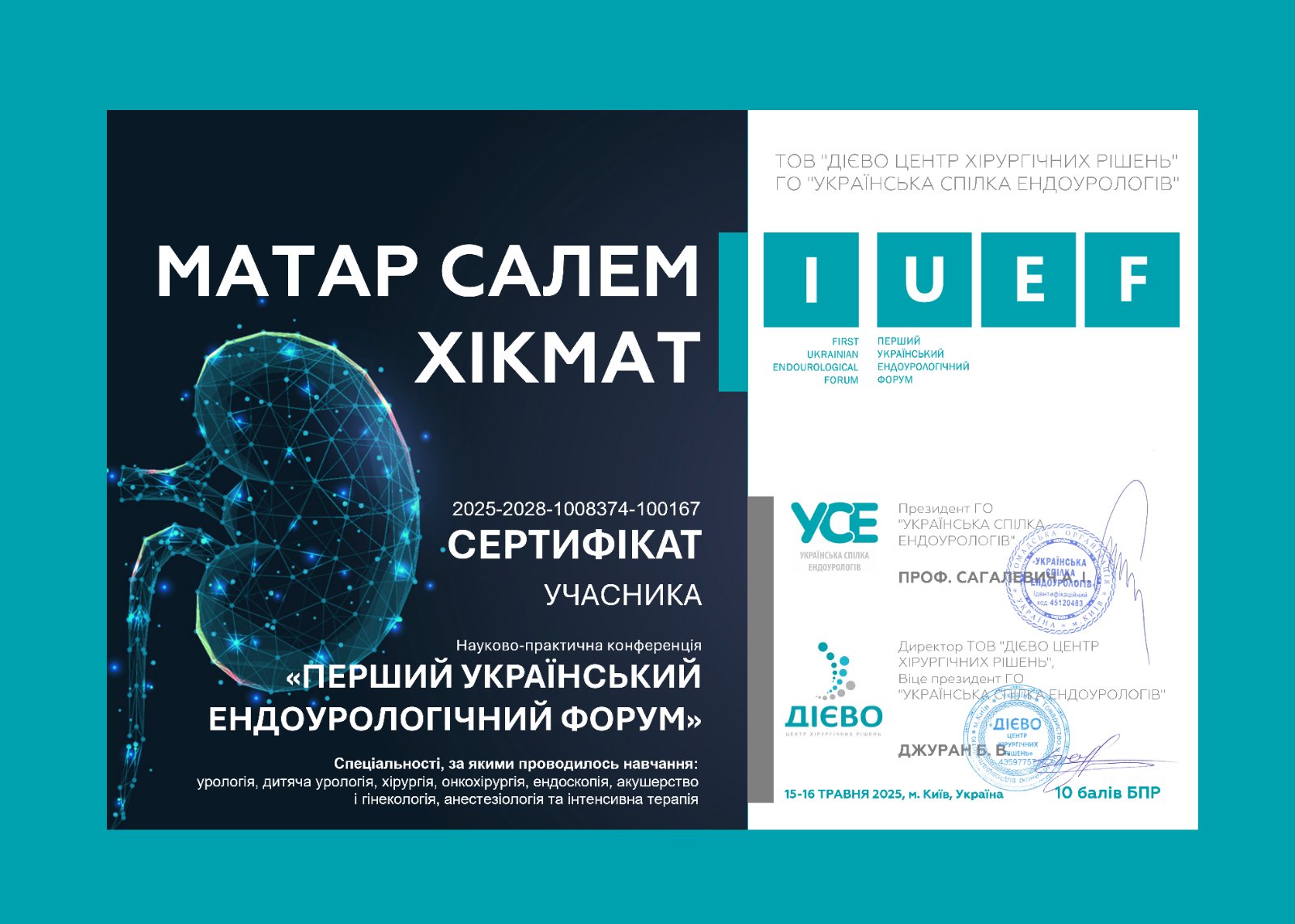 Хотів би подякувати урологу Матару Салему Хікмат, спасибі Вам велике за професіоналізм і швидкість вирішення питання. Було і швидко і по справі. Дуже рекомендую!