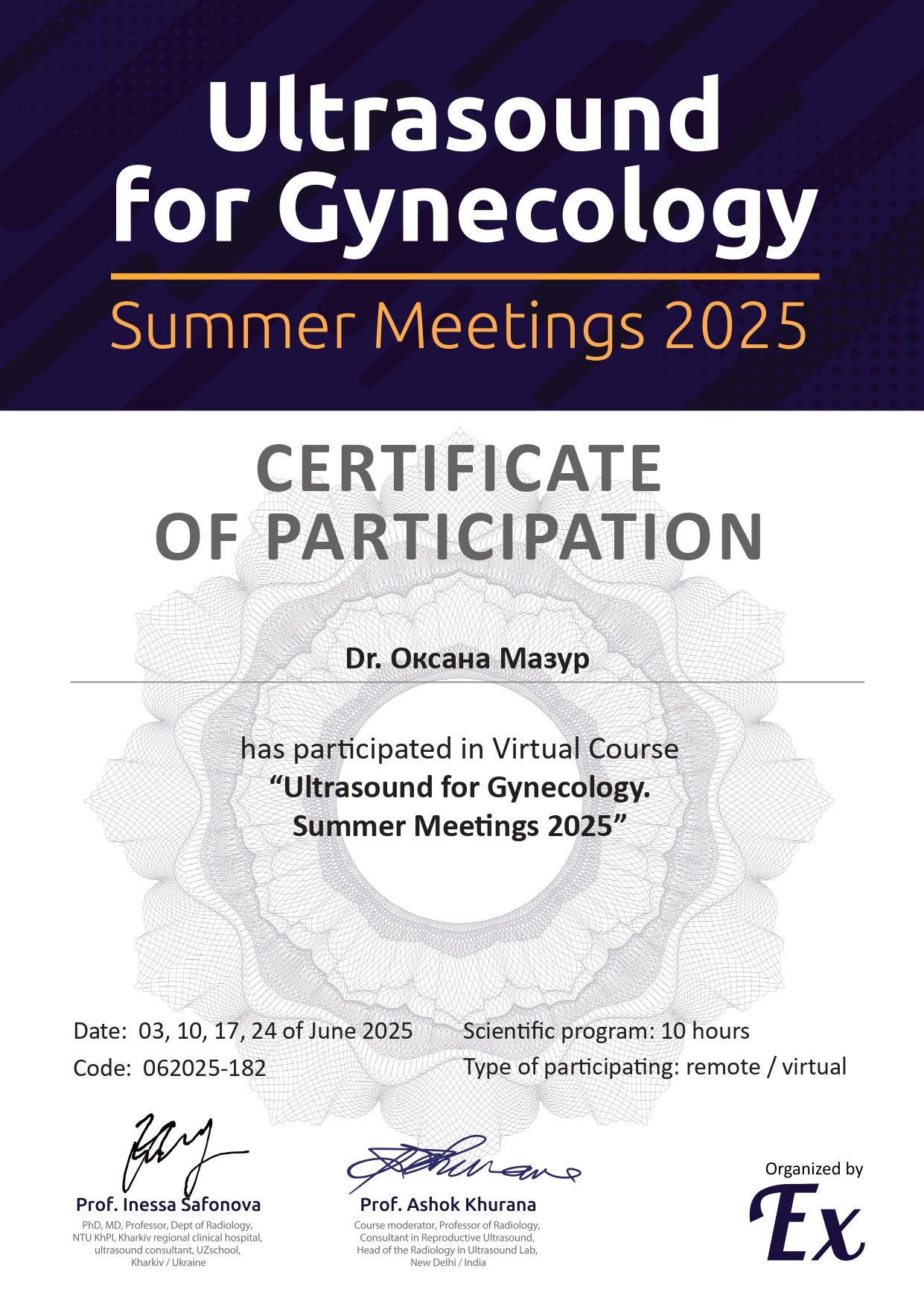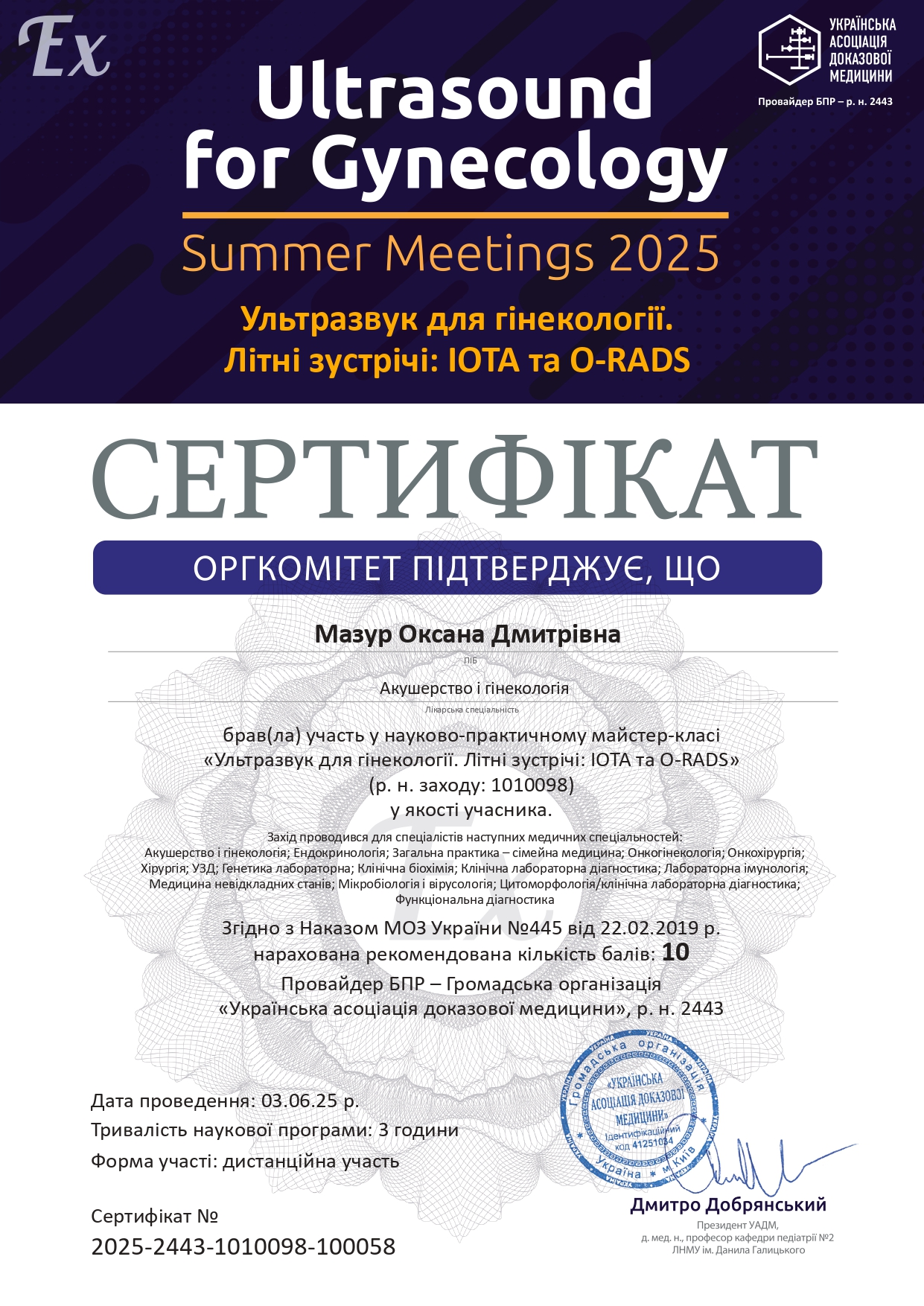 - Міжнародний інформаційний курс із майстер-класом “Ультразвукове дослідження яєчників: від норми до канцеру” - 14.09-16.11.2021 р.