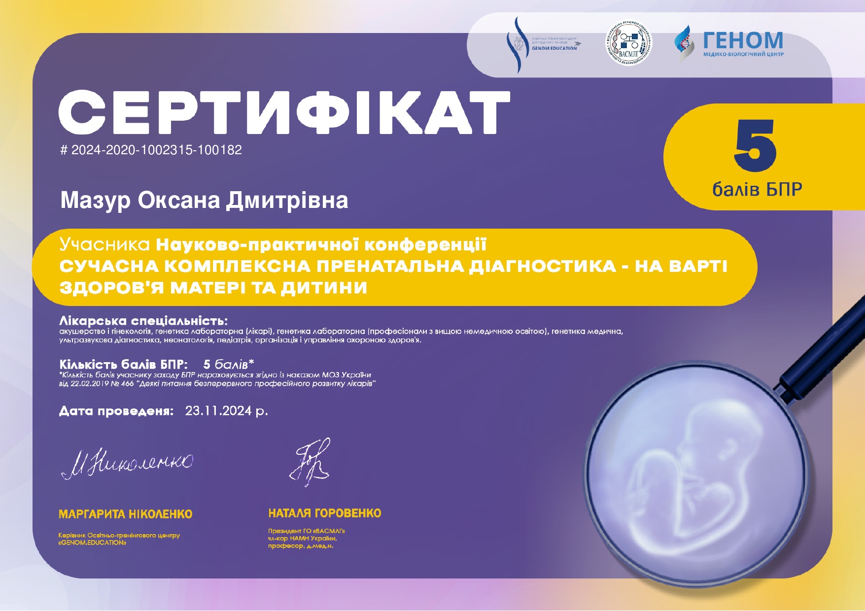 - Науково-практична конференція “Новітні технології в акушерстві, гінекології та перинатології” - спікер (доповідач) — 10.10-11.10.2019 р.