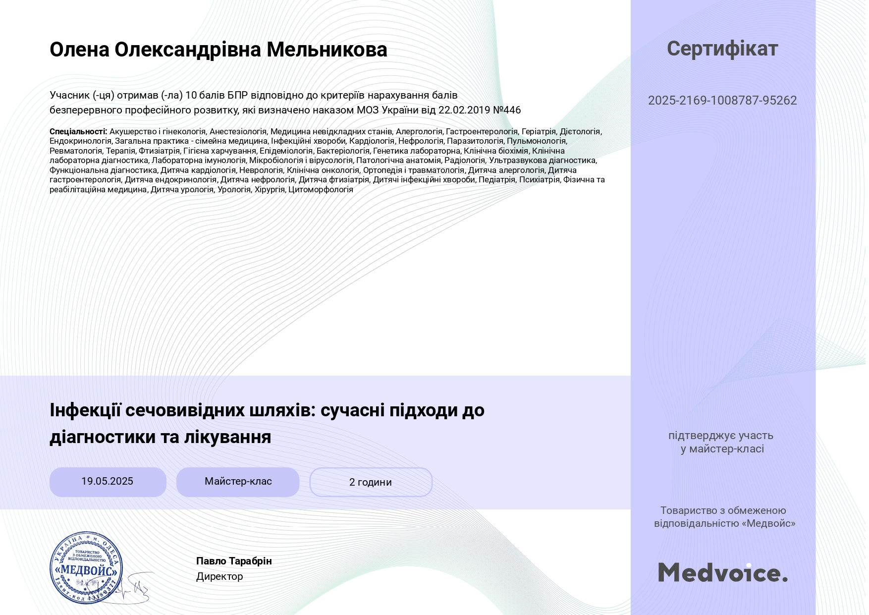- "Інфекції сечовивідних шляхів: сучасні підходи до діагностики та лікування" (Одеса, 2025)