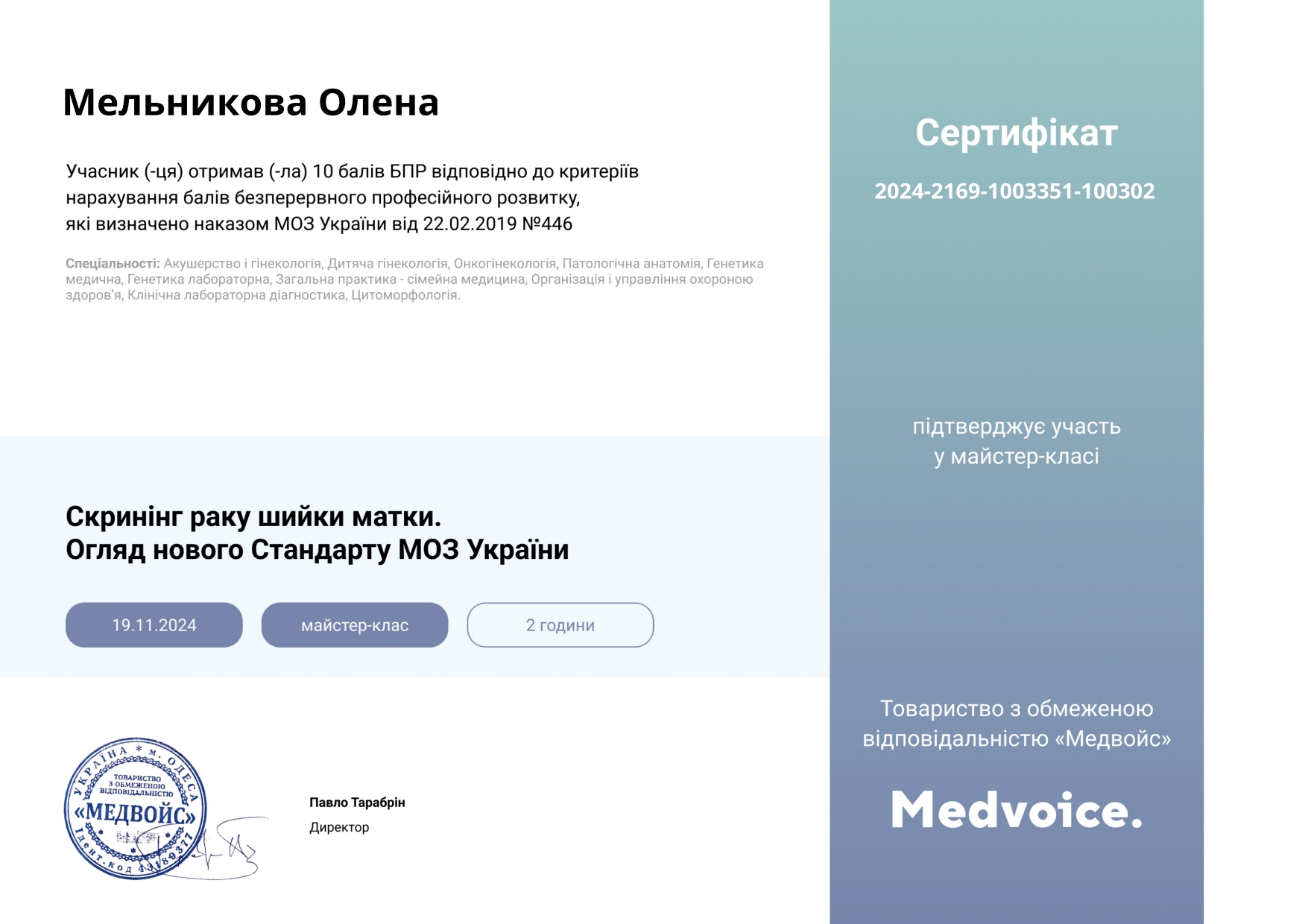 - "Скринінг раку шийки матки. Огляд нового Стандарту МОЗ України" (Одеса, 2024)