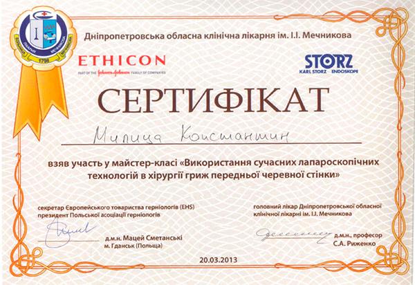 - Майстер-клас «Використання сучасних лапароскопічних технологій в хірургії гриж передньої черевної стінки» (Gdansk, Poland, 2013)