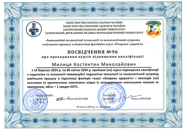 - Запорізька медична академія післядипломної освіти - отримання сертифіката лікаря-спеціаліста за спеціальністю «Організація і управління охороною здоров'я» (2018 р.)