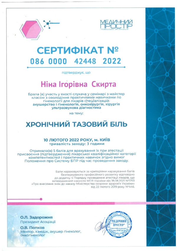 - Интернатура в Запорожской медицинской академии после дипломного образования и получение сертификата по специальности "Акушерство и гинекология" (2021 г)