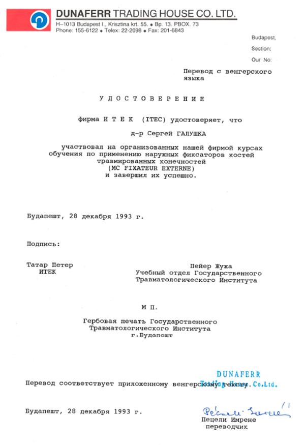 - Курсы по применению наружных фиксаторов костей травмированных конечностей MC FIXATEUR EXTERNE (Budapest, Hungary, 1993)