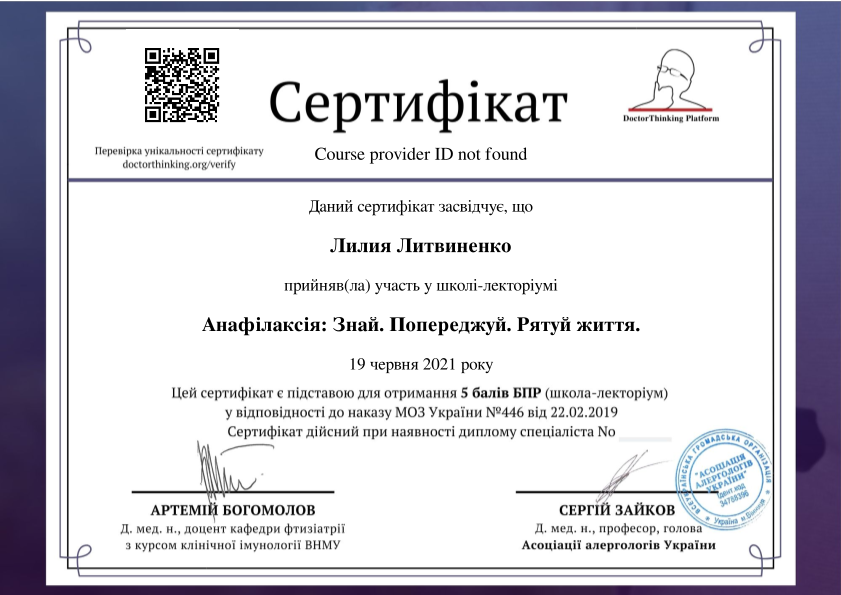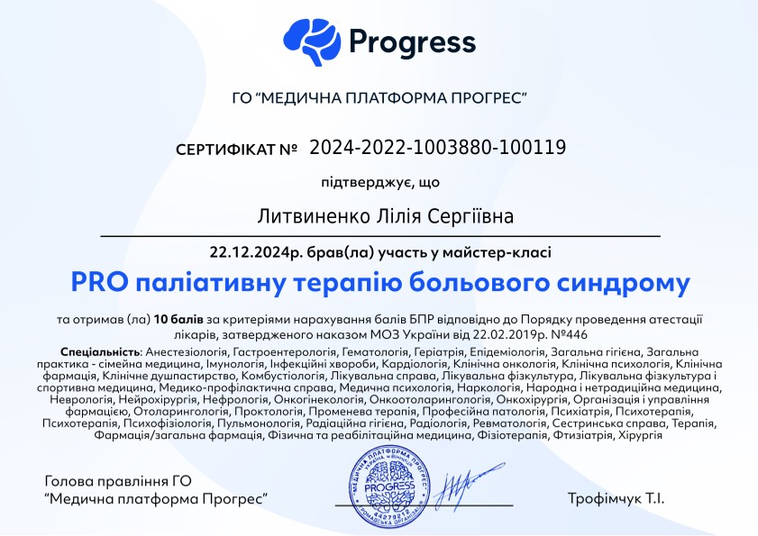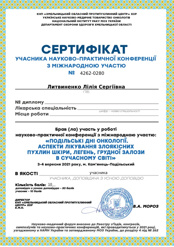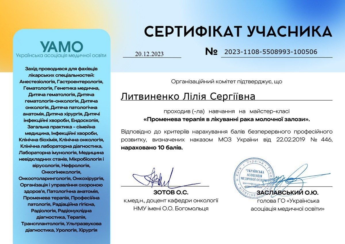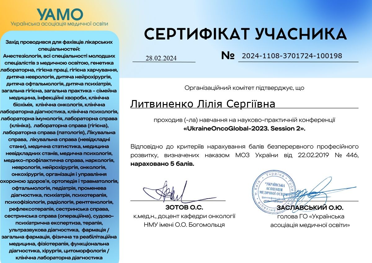• Интернатура „Клиническая онкология“, Запорожский государственный медицинский университет (2023 г.)