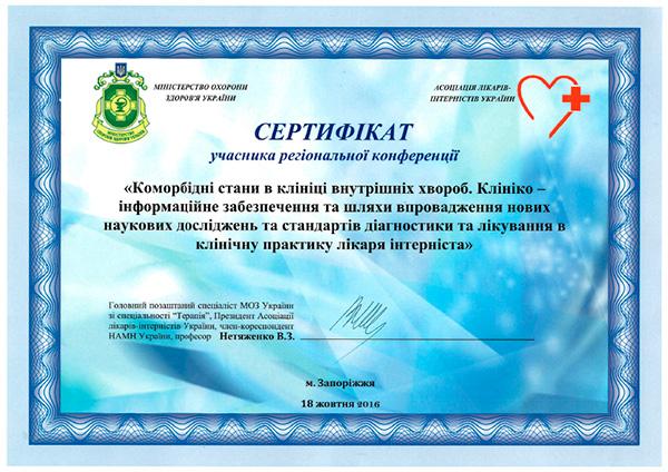 • Интернатура в Запорожском государственном медицинском университете и получение сертификата по специальности «Терапия» (2003 г.)