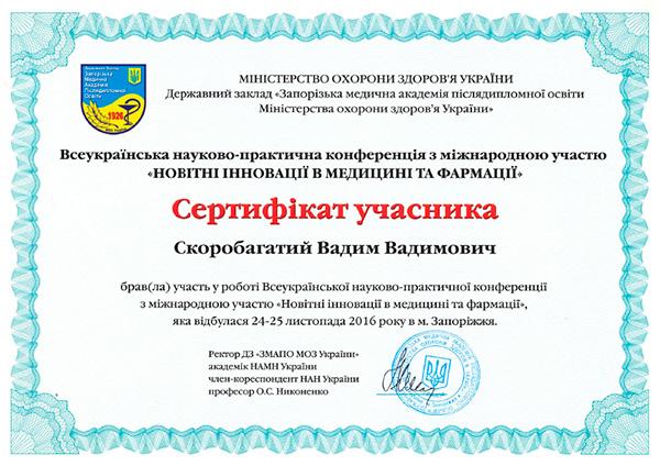 - Научно-практическая конференция «Новейшие инновации в медицине и фармации» (Запорожье, 2016)