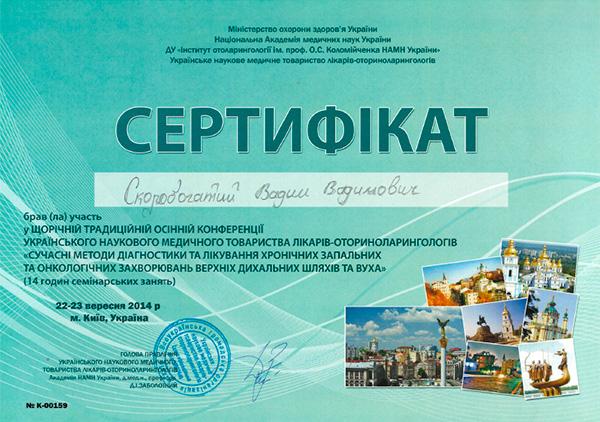 - Конференция «Современные методы диагностики и лечения хронических воспалительных и онкологических заболеваний верхних дыхательных путей и уха» (Киев, 2014)